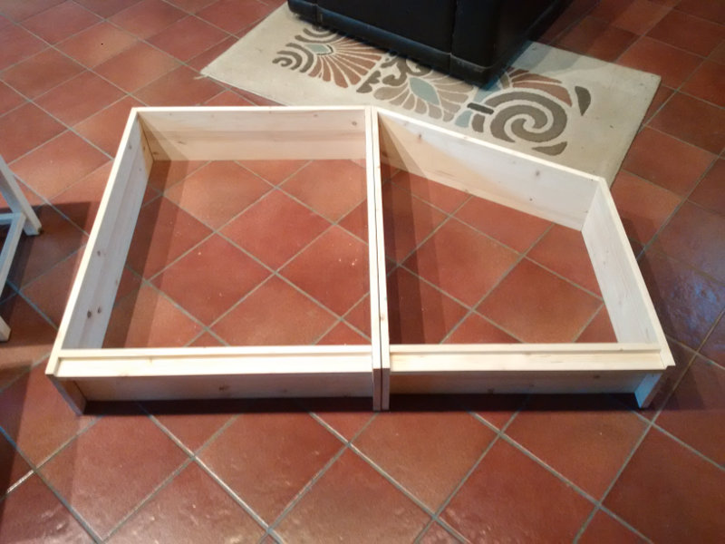 Queste due sezioni sono di uguale larghezza, facilmente determinata dividendo a metà lo spazio residuo disponibile sotto alla rampa. Per prima cosa ho preparato la parte inferiore delle due sezioni tagliando un pezzo di tavola da 40 cm alla giusta lunghezza (pari alla metà della lunghezza totale disponibile detratto lo spessore delle 2 pareti laterali). Tagliando poi questo pezzo a metà per il lato lungo ho ottenuto due tavole identiche che formano la parte inferiore delle due sezioni.
