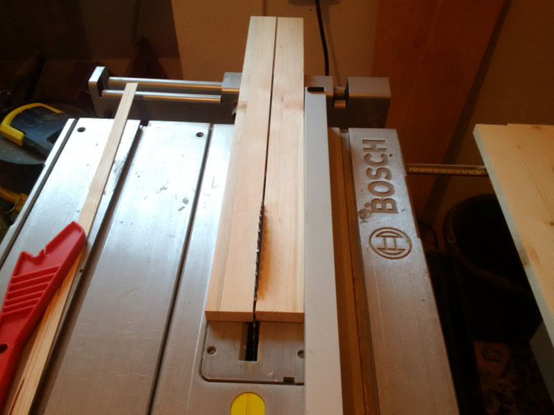 Da una tavola di abete lamellare, spessore 18 mm ho tagliato con il banco sega 4 listelli di 6 cm di larghezza.